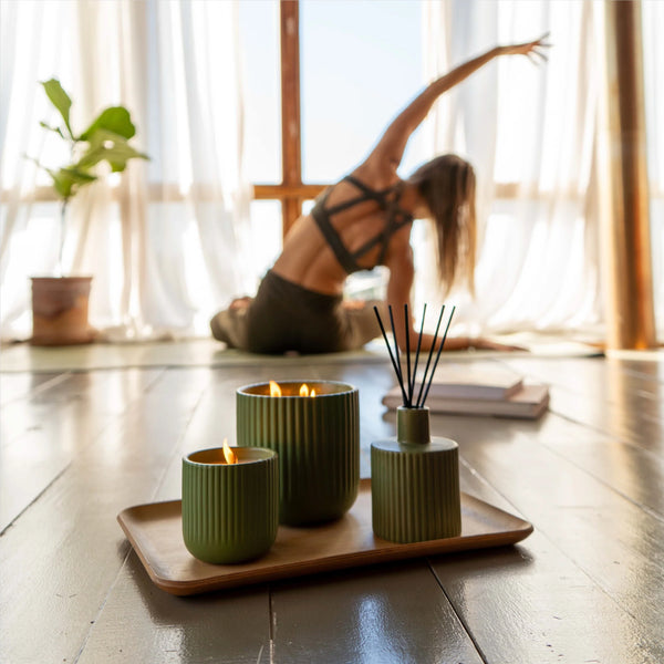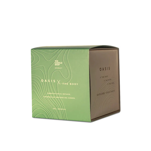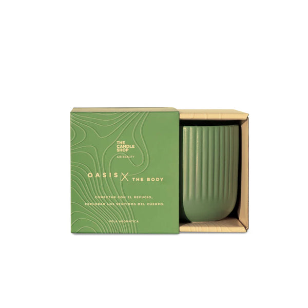 Vela de soja en contenedor de cerámica. La colección Oasis promueve un estado de armonía y experiencia sensorial y emocional enfocada en el bienestar personal.